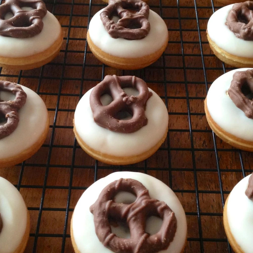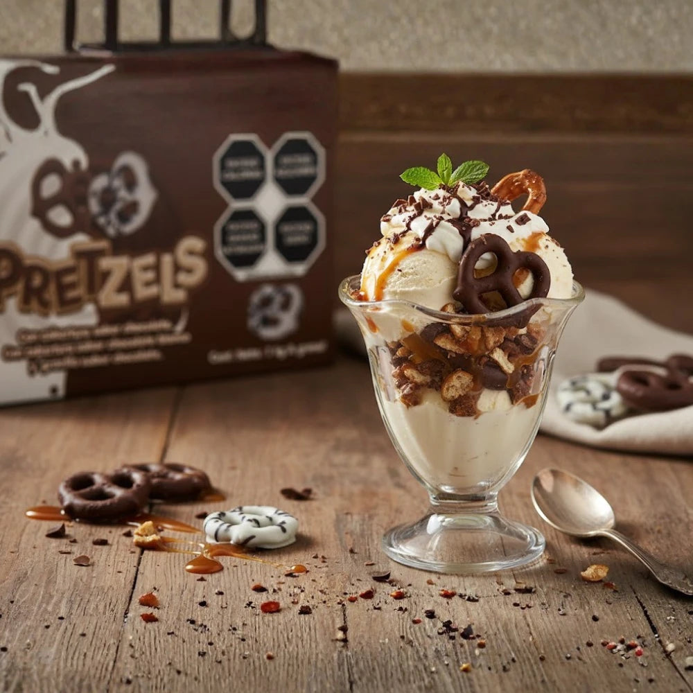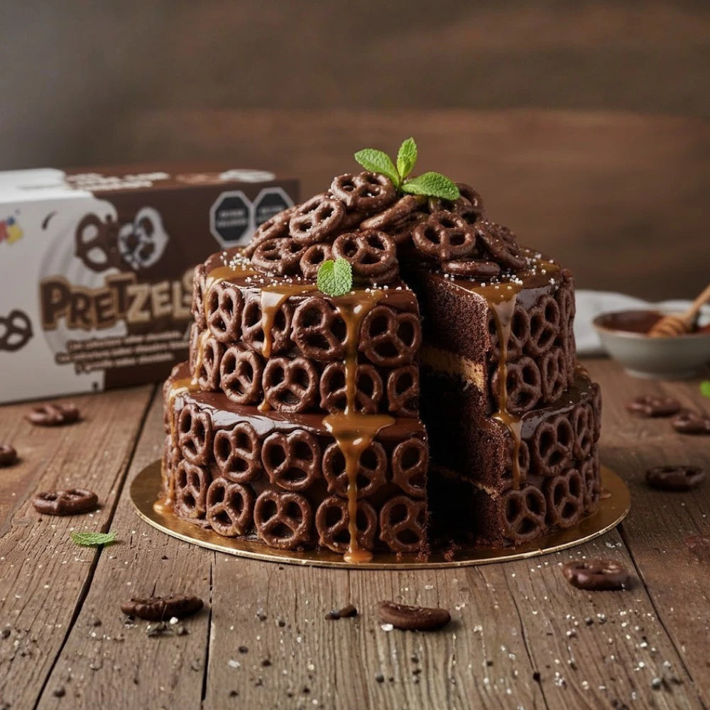 Pretzel cubierto de chocolate de la mejor calidad, pretzel crujiente ideal como decoración o snack, entre otros.