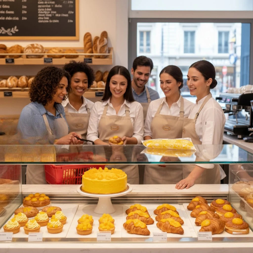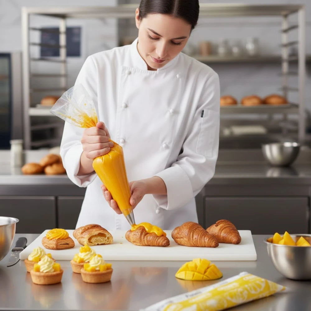 Mermelada de mango lista para usar, ideal para creaciones dulces, se puede utilizar en la realización de productos de panadería, repostería en pasteles y tartas, crepas, rellenos de galletas y postres. Relleno cremoso horneable sabor mango listo para usar como cobertura o relleno.
